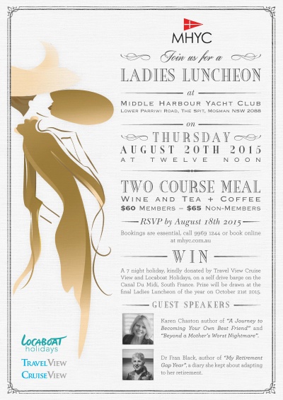 The third of MHYC's four Ladies Lunches will be held on Thursday 20th August, 2015, from 12 noon. Two guest speakers will be speaking on their experiences - Dr Fran Black, who will be talking about her book, "My Retirement Gap Year", on adapting to retirement. Our second speaker will be Karen Chaston, talking about her books, "Beyond a Mother's Worst Nightmare" and "A Journey to Becoming Your Own Best Friend." $60 Members, $65 Non members for wine, 2 course lunch and tea or coffee. Come along to be in the chance to win a 7 night self-drive barge holiday on the Canal du Midi in the South of France compliments of Locaboat Holidays & TravelView.